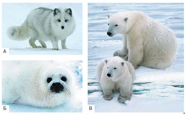 что, как правило, недоступны для врагов. Рис. 155. Покровительственная окраска позволяет птицам сливаться с ландшафтом Рис. 156. Белая окраска животных Крайнего Севера: А – песец; Б – детёныш тюленя; В – полярный медведь Покровительственную