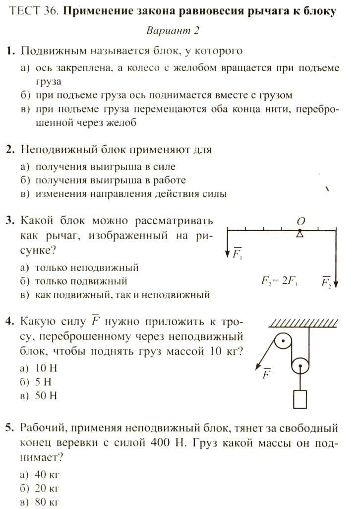 ТЕСТ 36. ПРИМЕНЕНИЕ ЗАКОНА РАВНОВЕСИЯ РЫЧАГА К БЛОКУ