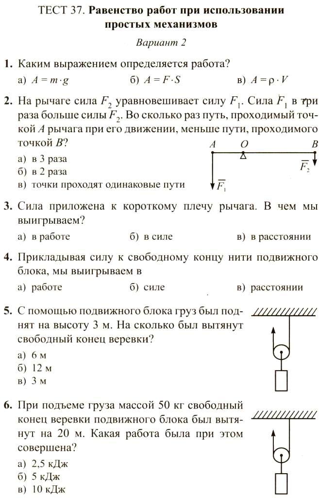 ТЕСТ 37. РАВЕНСТВО РАБОТ ПРИ ИСПОЛЬЗОВАНИИ ПРОСТЫХ МЕХАНИЗМОВ