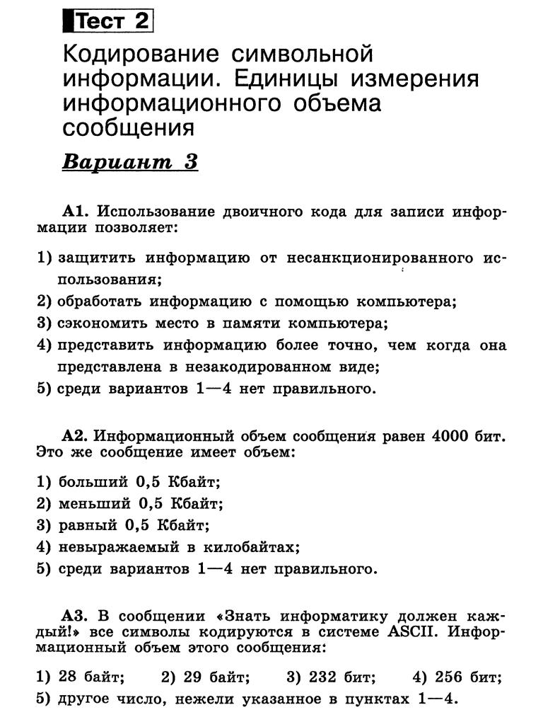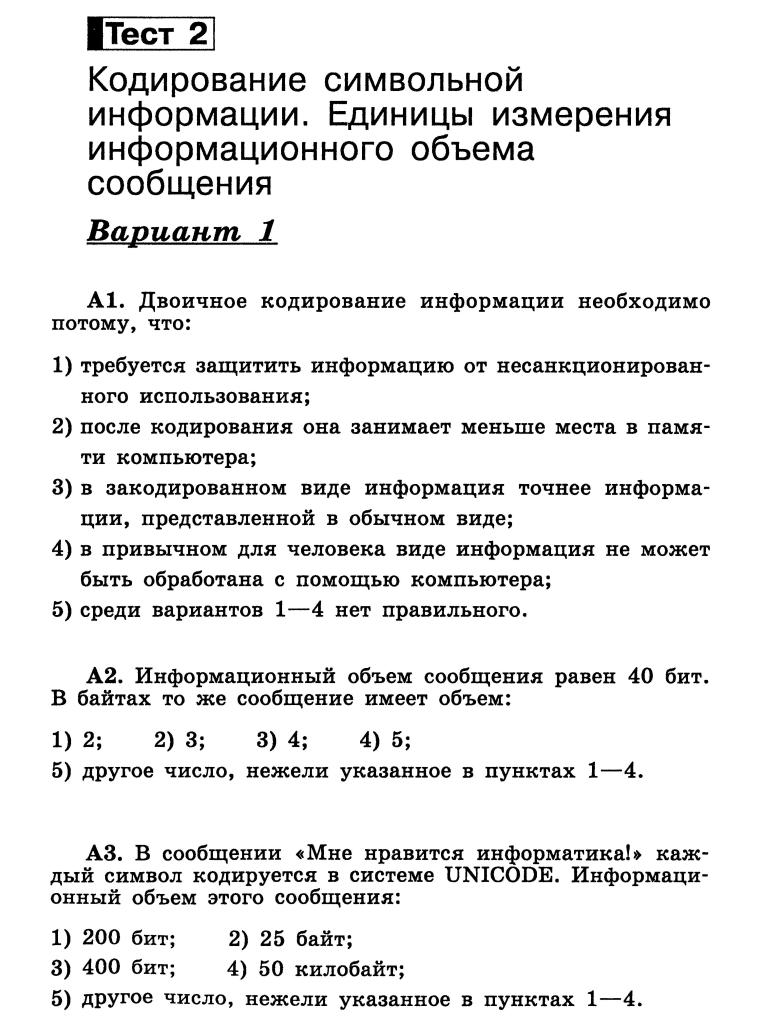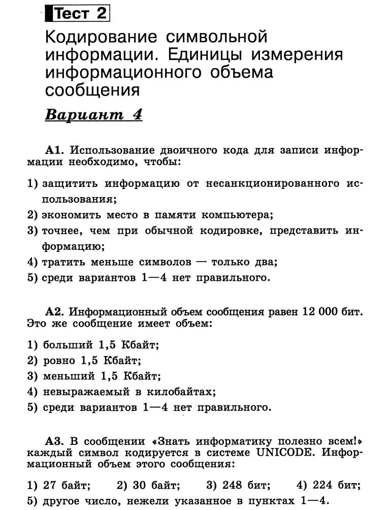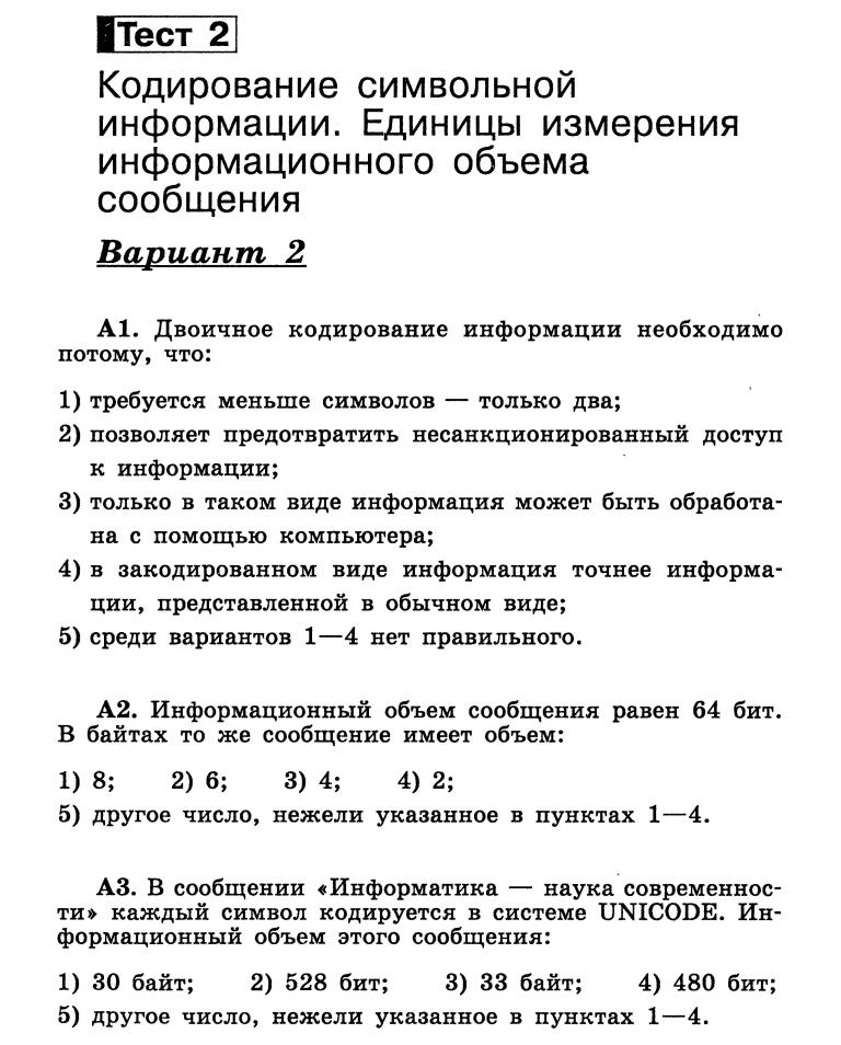 ТЕСТ 2. КОДИРОВАНИЕ СИМВОЛЬНОЙ ИНФОРМАЦИИ. ЕДИНИЦЫ ИЗМЕРЕНИЯ ИНФОРМАЦИОННОГО ОБЪЕМА СООБЩЕНИЯ